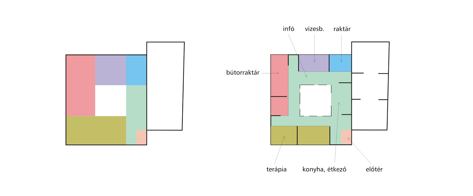 A személyes terek a pincéjükkel kapcsolódnak a belső-közösségi térhez, s a kis pincék között így kialakuló negatív terekben jelennek meg a közös funkciók (konyha-étkező, terápia szobák, infó sarok, vizesblokk (+mosókonyha), raktár, bejárati rész).